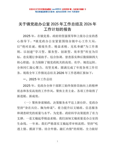 / 关于镇党政办公室2025年工作总结及2026年工作计划的报告