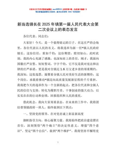 / 新当选镇长在2025年镇第一届人民代表大会第二次会议上的表态发言