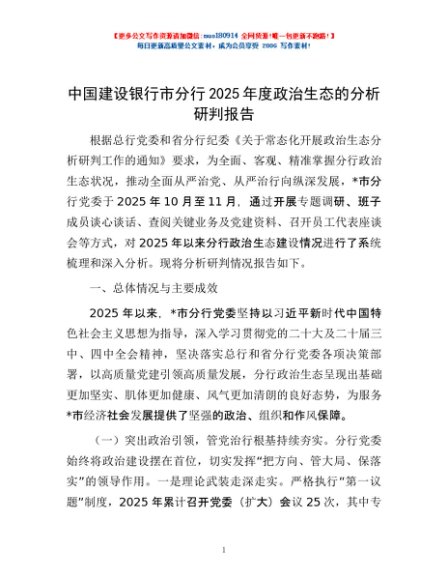 / 中国建设银行市分行2025年度政治生态的分析研判报告