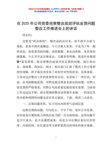 / 在2025年公司党委巡察整改成效评估反馈问题整改工作推进会上的讲话