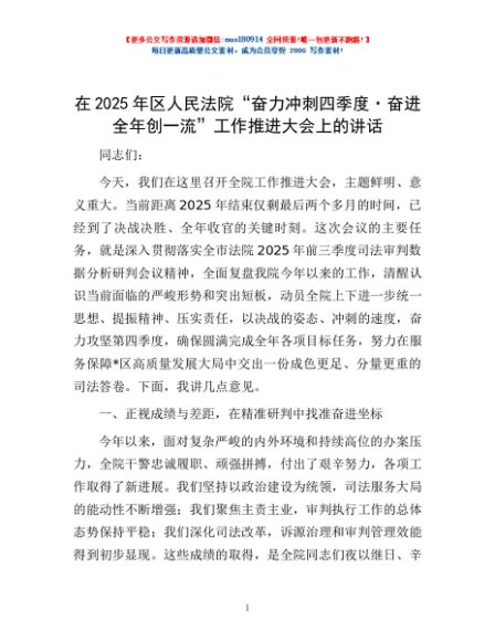 / 在2025年区人民法院“奋力冲刺四季度·奋进全年创一流”工作推进大会上的讲话