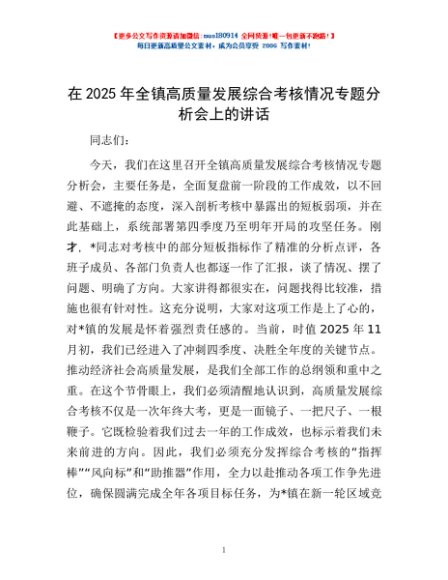 / 在2025年全镇高质量发展综合考核情况专题分析会上的讲话