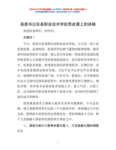 / 县委书记在县职业技术学校思政课上的讲稿