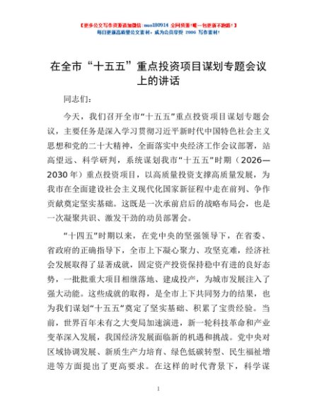 / 在全市“十五五”重点投资项目谋划专题会议上的讲话