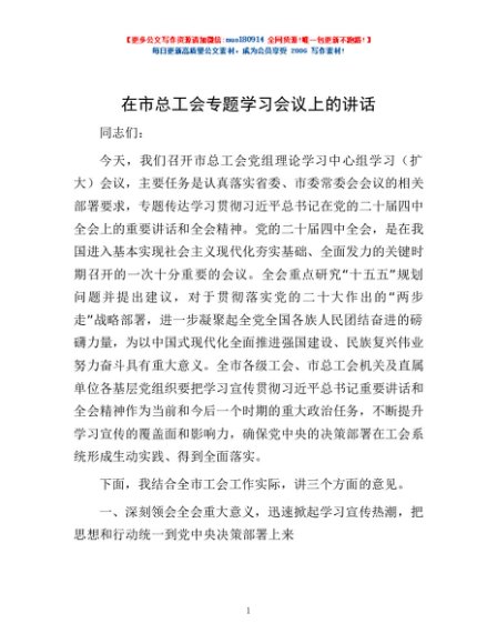 / 在市总工会专题学习会议上的讲话