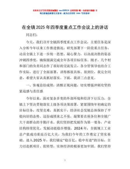 / 在全镇2025年四季度重点工作会议上的讲话