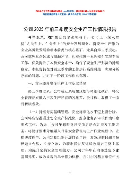 / 公司2025年前三季度安全生产工作情况报告
