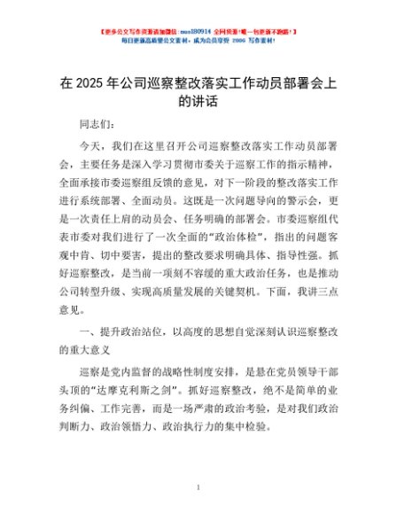 / 在2025年公司巡察整改落实工作动员部署会上的讲话