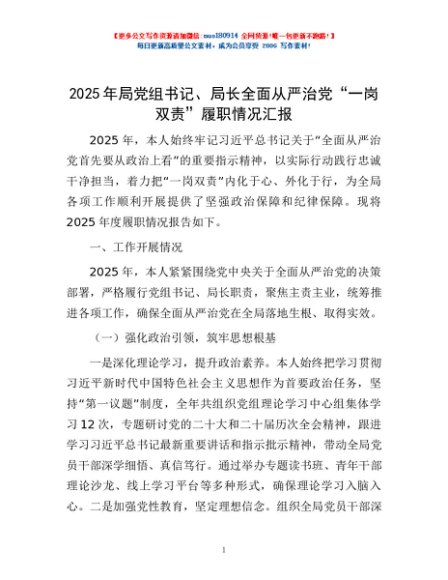 / 2025年局党组书记、局长全面从严治党“一岗双责”履职情况汇报