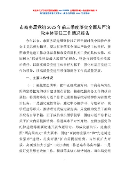 / 市商务局党组2025年前三季度落实全面从严治党主体责任工作情况报告