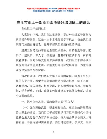/ 在全市组工干部能力素质提升培训班上的讲话