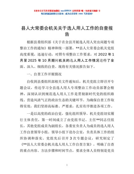 / 县人大常委会机关关于选人用人工作的自查报告