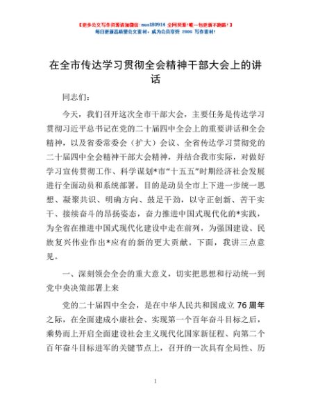 / 在全市传达学习贯彻全会精神干部大会上的讲话