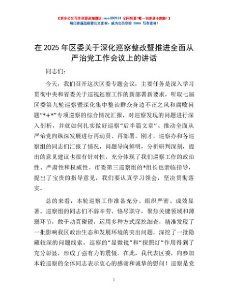 / 在2025年区委关于深化巡察整改暨推进全面从严治党工作会议上的讲话