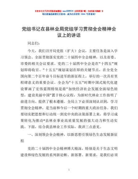 / 党组书记在县林业局党组学习贯彻全会精神会议上的讲话