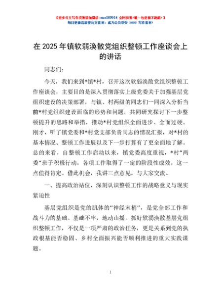 / 在2025年镇软弱涣散党组织整顿工作座谈会上的讲话