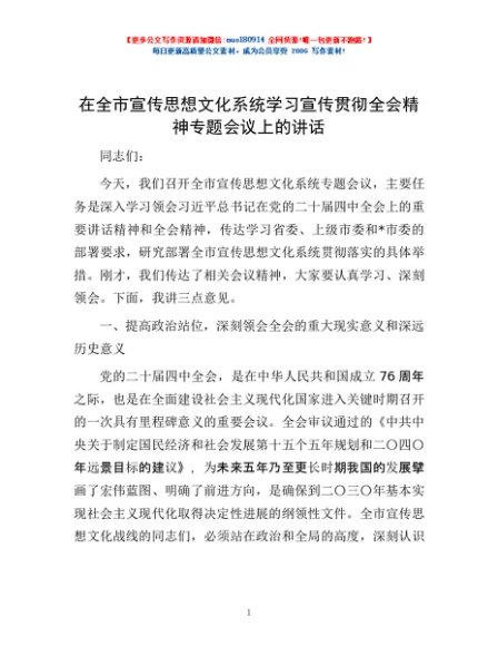 / 在全市宣传思想文化系统学习宣传贯彻全会精神专题会议上的讲话