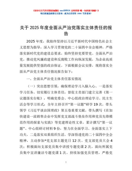 / 关于2025年度全面从严治党落实主体责任的报告