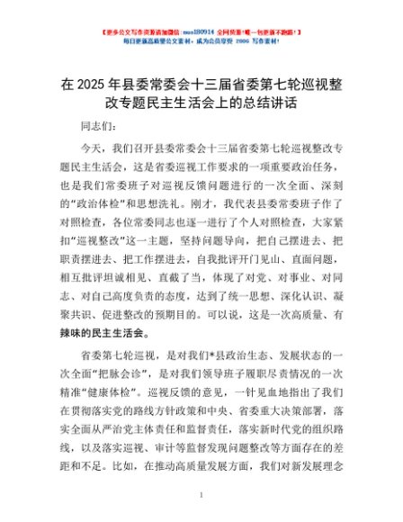 / 在2025年县委常委会十三届省委第七轮巡视整改专题民主生活会上的总结讲话