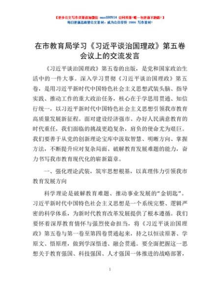/ 在市教育局学习《习近平谈治国理政》第五卷会议上的交流发言