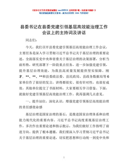 / 县委书记在县委党建引领基层高效能治理工作会议上的主持词及讲话