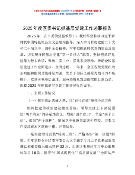 / 2025年度区委书记抓基层党建工作述职报告