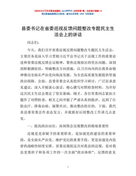 / 县委书记在省委巡视反馈问题整改专题民主生活会上的讲话