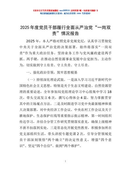 / 2025年度党员干部履行全面从严治党“一岗双责”情况报告