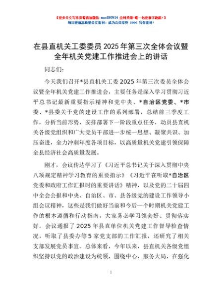 / 在县直机关工委委员2025年第三次全体会议暨全年机关党建工作推进会上的讲话
