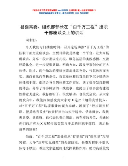 / 县委常委、组织部部长在“百千万工程”挂职干部座谈会上的讲话