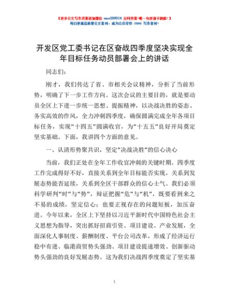 / 开发区党工委书记在区奋战四季度坚决实现全年目标任务动员部署会上的讲话