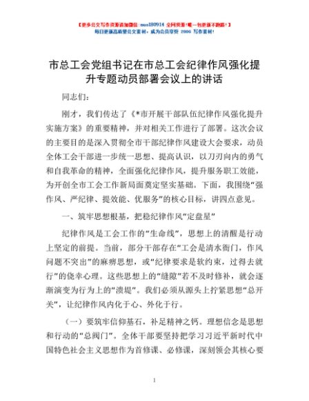 / 市总工会党组书记在市总工会纪律作风强化提升专题动员部署会议上的讲话