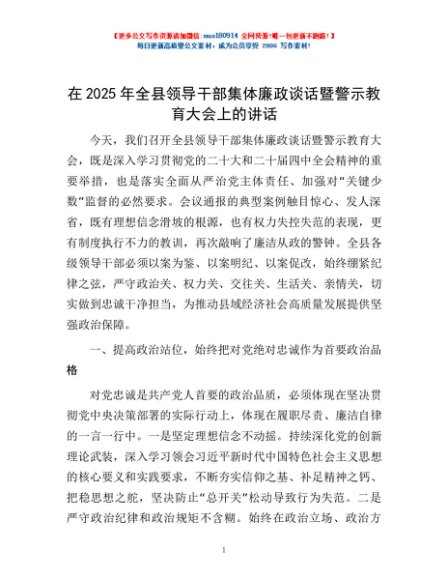 / 在2025年全县领导干部集体廉政谈话暨警示教育大会上的讲话