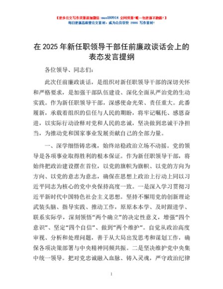 / 在2025年新任职领导干部任前廉政谈话会上的表态发言提纲