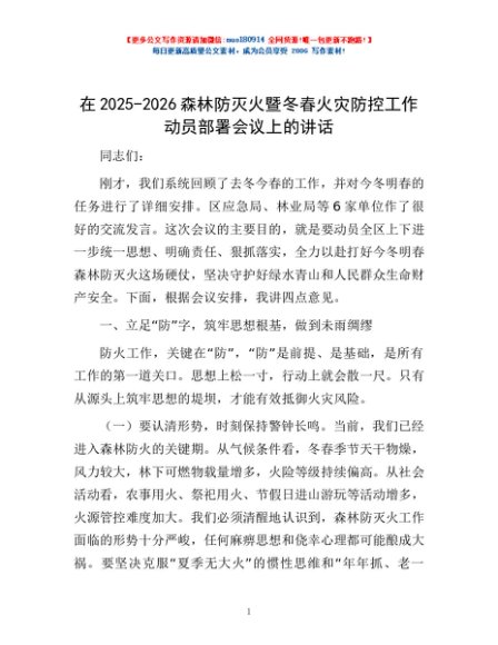 / 在2025-2026森林防灭火暨冬春火灾防控工作动员部署会议上的讲话