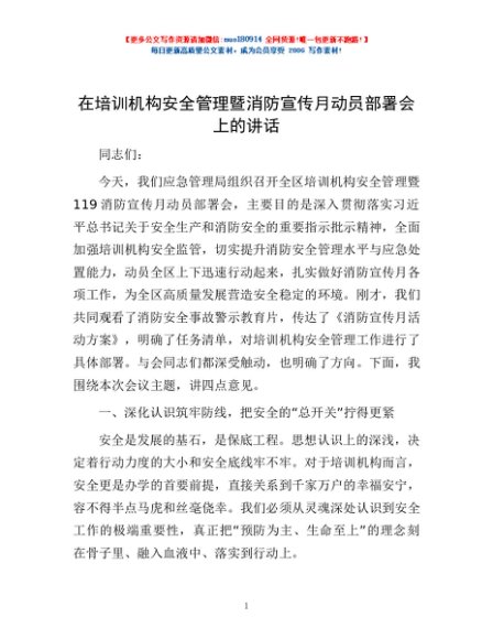 / 在培训机构安全管理暨消防宣传月动员部署会上的讲话