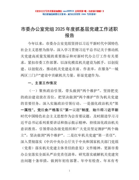/ 市委办公室党组2025年度抓基层党建工作述职报告