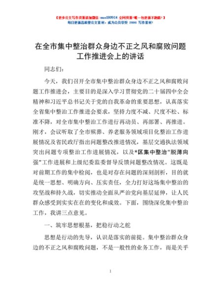 / 在全市集中整治群众身边不正之风和腐败问题工作推进会上的讲话