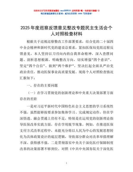 / 2025年度巡察反馈意见整改专题民主生活会个人对照检查材料