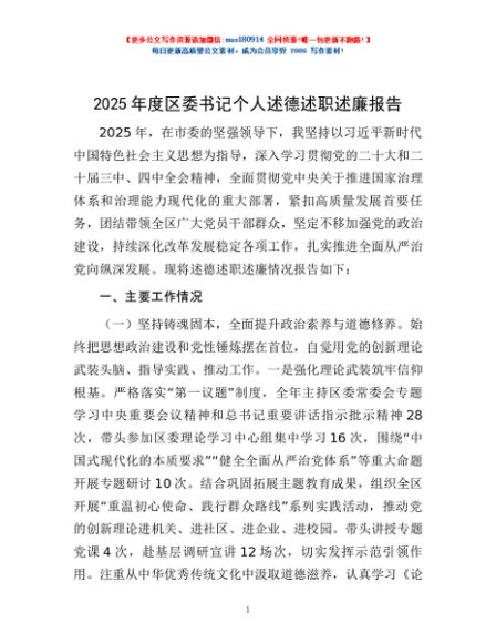 / 2025年度区委书记个人述德述职述廉报告