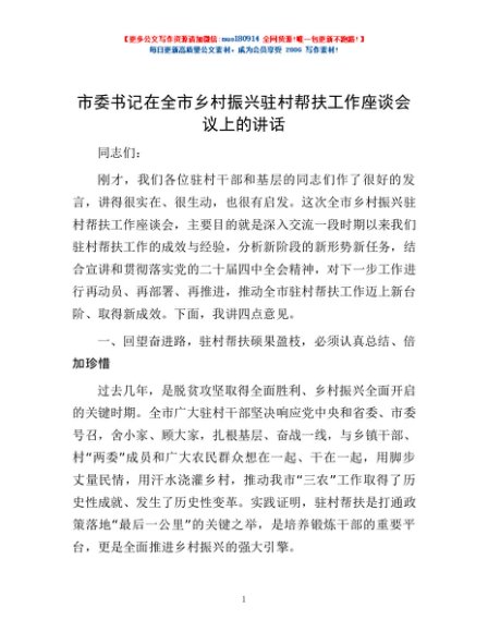 / 市委书记在全市乡村振兴驻村帮扶工作座谈会议上的讲话
