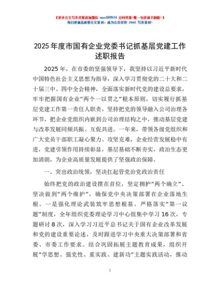 / 2025年度市国有企业党委书记抓基层党建工作述职报告