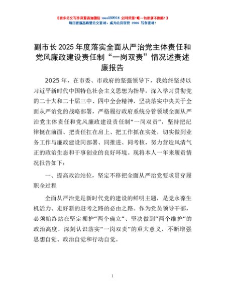 / 副市长2025年度落实全面从严治党主体责任和党风廉政建设责任制“一岗双责”情况述责述廉报告