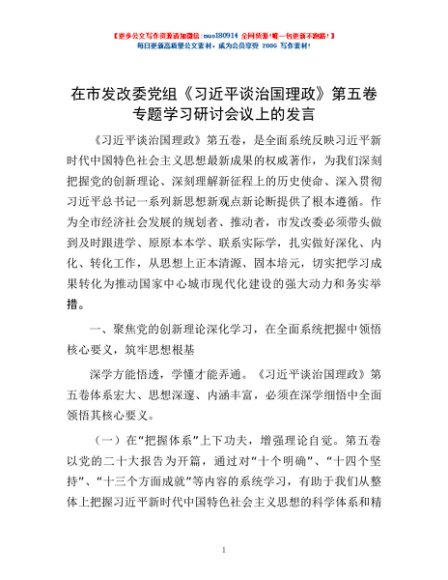 / 在市发改委党组《习近平谈治国理政》第五卷专题学习研讨会议上的发言
