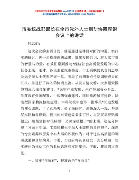 / 市委统战部部长在全市党外人士调研协商座谈会议上的讲话