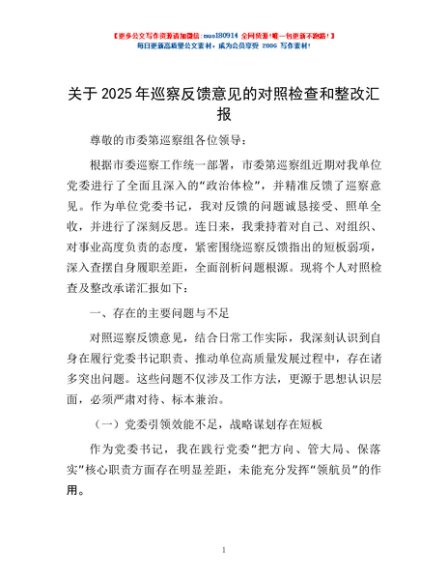 / 关于2025年巡察反馈意见的对照检查和整改汇报