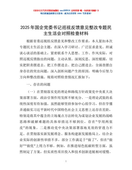 / 2025年国企党委书记巡视反馈意见整改专题民主生活会对照检查材料