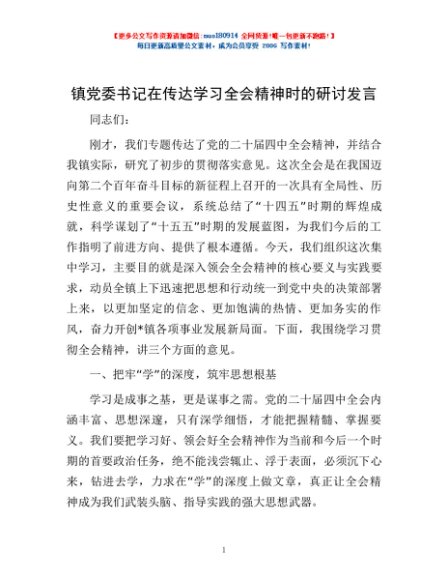 / 镇党委书记在传达学习全会精神时的研讨发言