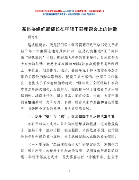 / 某区委组织部部长在年轻干部座谈会上的讲话