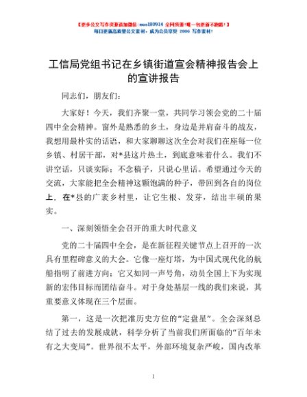 / 工信局党组书记在乡镇街道宣会精神报告会上的宣讲报告